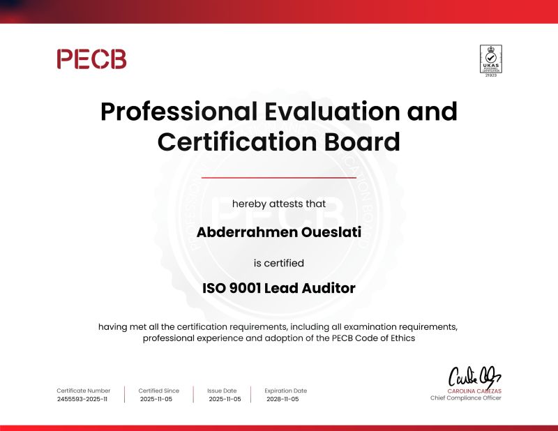 12 novembre 2025La certification ISO 9001 Lead Auditor, délivrée par PECB, vient d’être attribuée à Abderrahmen OUESLATI, gérant de CC2i Consulting.