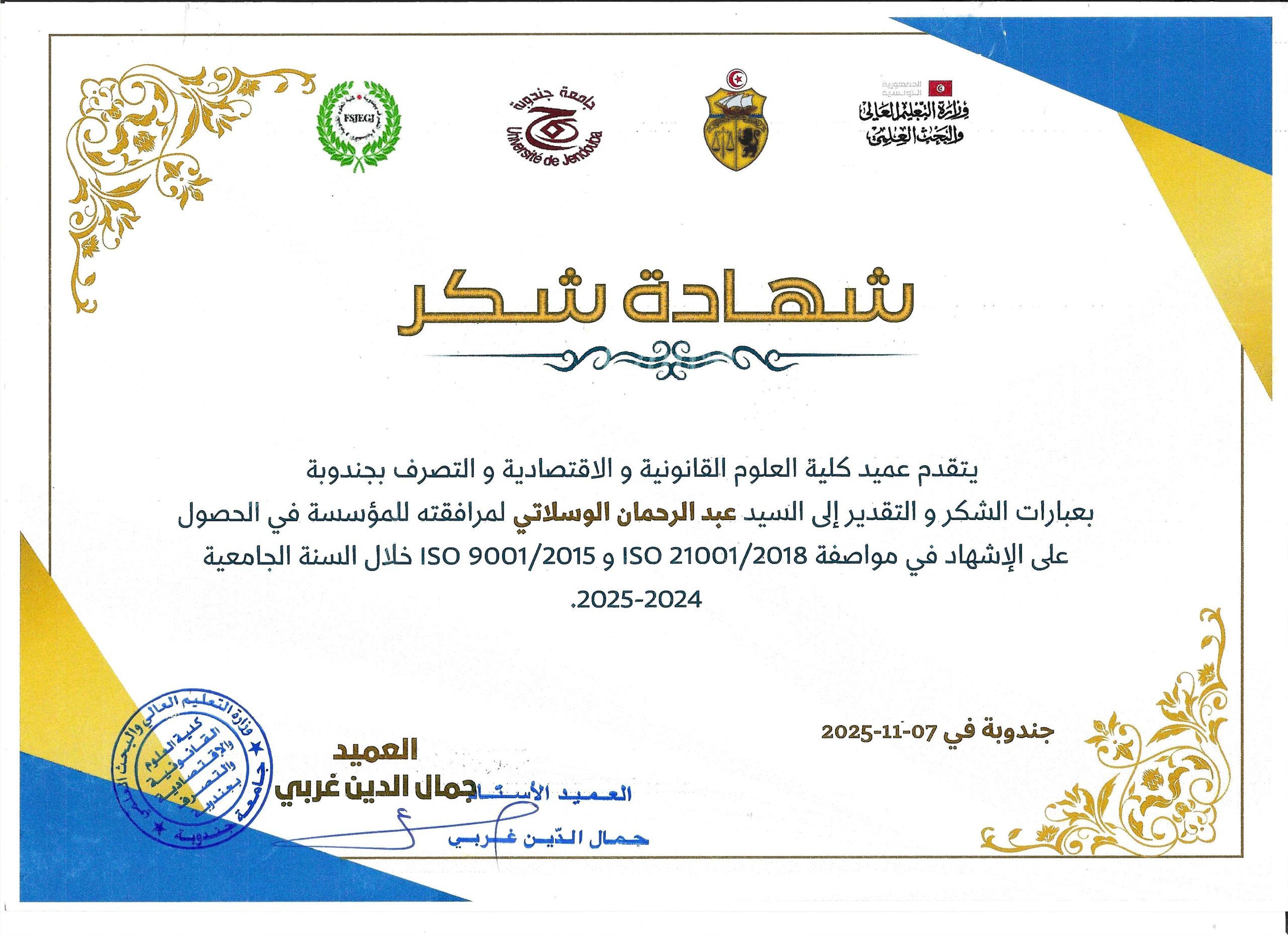 Le 7 novembre 2025, Monsieur Jamel-Eddine Gharbi, Doyen de la Faculté des Sciences Juridiques, Économiques et de Gestion de Jendouba (FSJEGJ), a procédé à la remise d’une distinction honorifique à Abderrahmen OUESLATI, gérant de CC2i Consulting, en reconnaissance de la qualité de l’accompagnement assuré dans le cadre des démarches de certification.