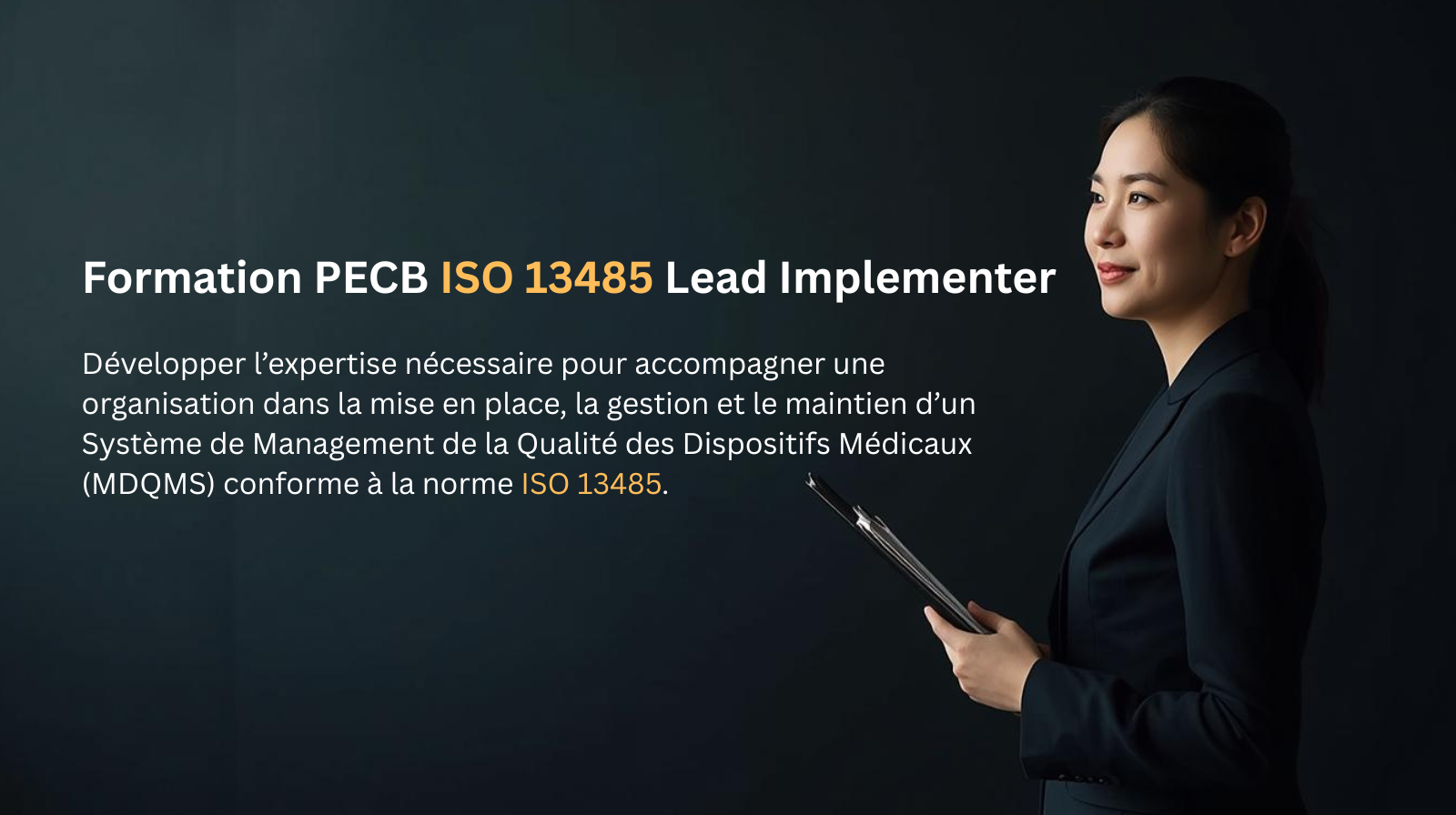 La formation ISO 13485 Lead Implementer vous permet de développer l’expertise nécessaire pour accompagner une organisation dans la mise en place, la gestion et le maintien d’un Système de Management de la Qualité des Dispositifs Médicaux (MDQMS) conforme à la norme ISO 13485. Au cours de cette formation, vous acquerrez également une compréhension approfondie des meilleures pratiques en matière de systèmes de management de la qualité des dispositifs médicaux et serez en mesure d’améliorer la performance globale d’une organisation en garantissant la fourniture constante de dispositifs médicaux sûrs et de qualité.