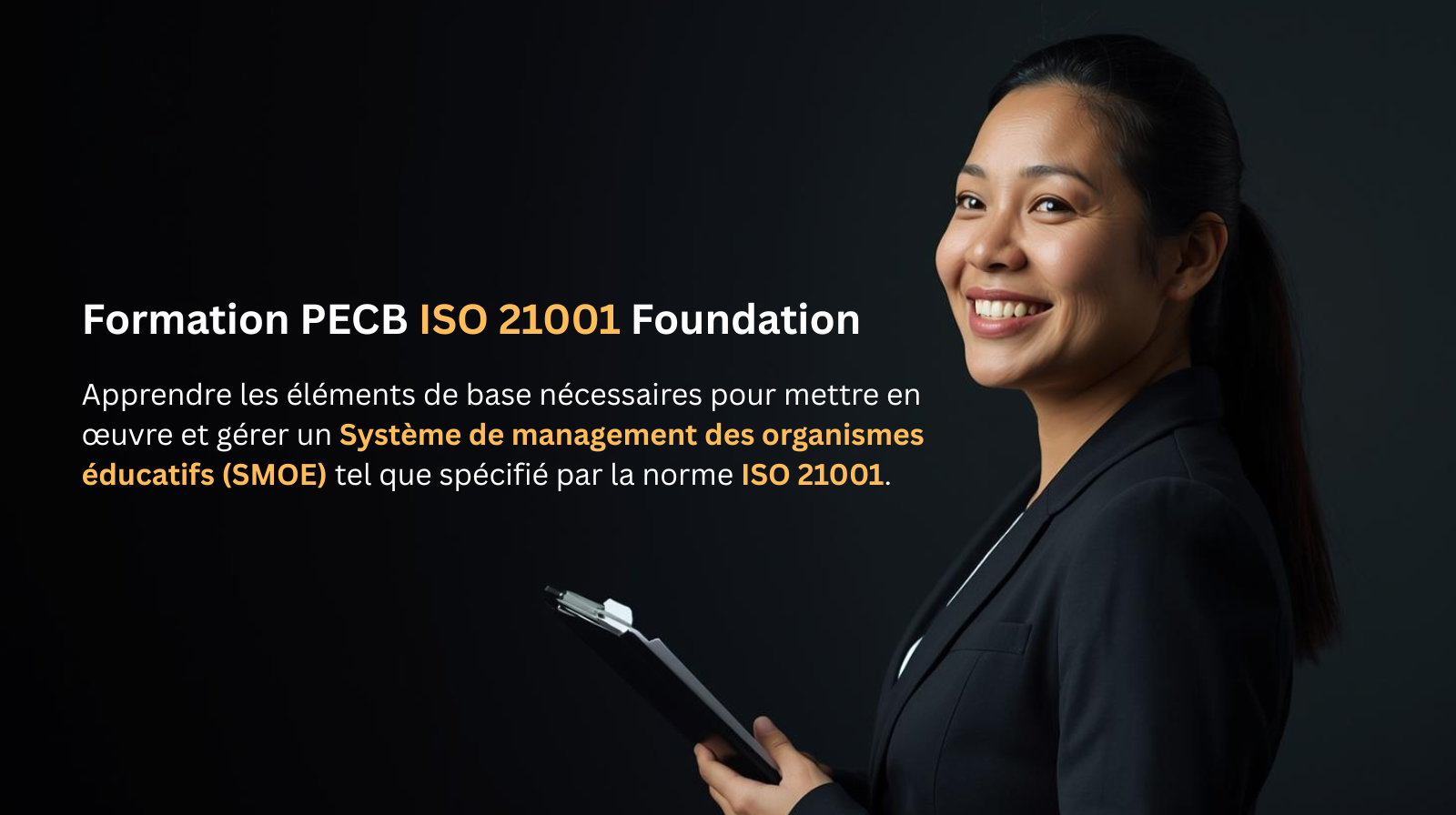 La formation ISO 21001 Foundation vous permet d’apprendre les éléments de base nécessaires pour mettre en œuvre et gérer un Système de management des organismes éducatifs (SMOE) tel que spécifié par la norme ISO 21001.