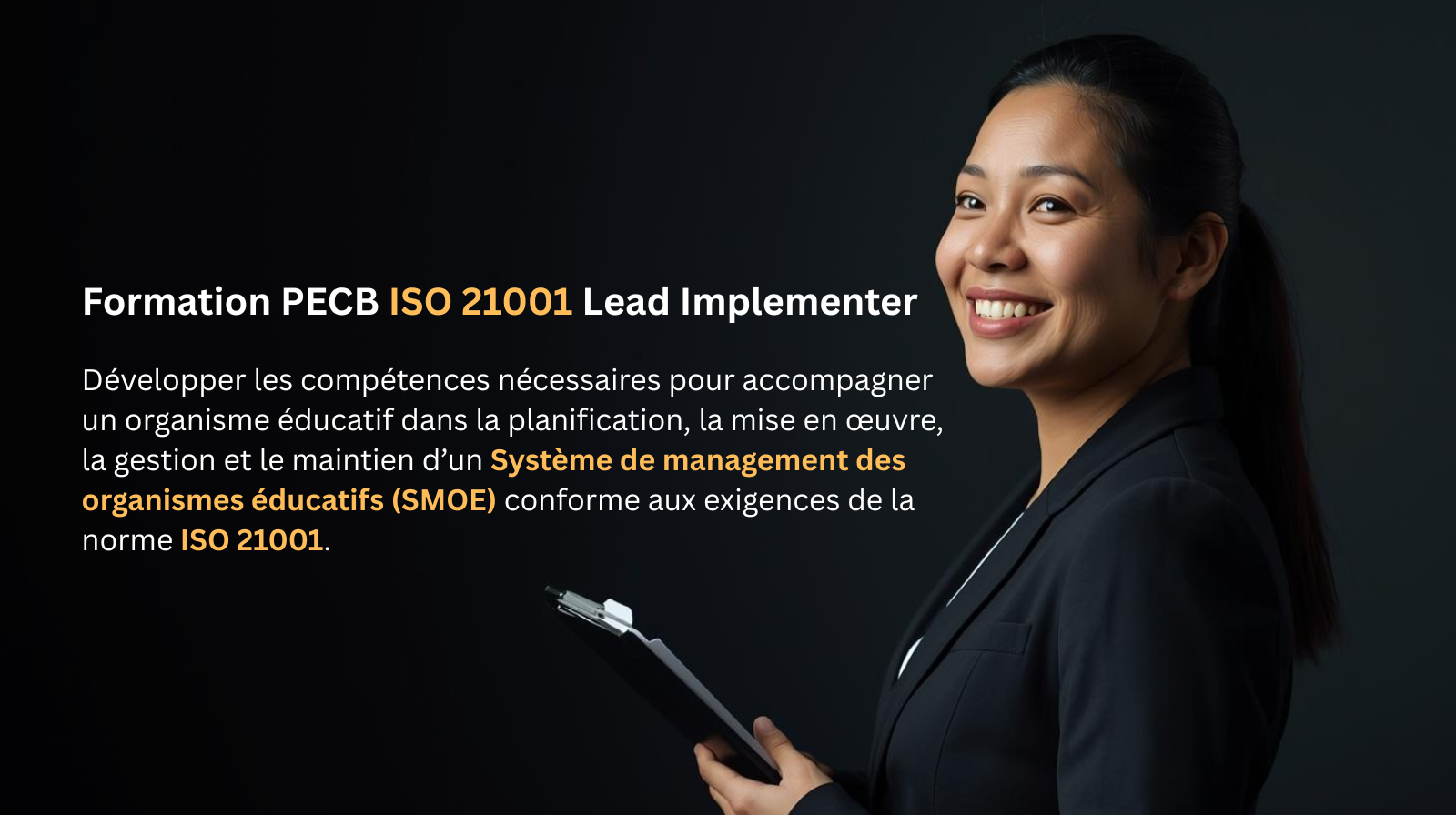 La formation ISO 21001 Lead Implementer vous permet de développer les compétences nécessaires pour accompagner un organisme éducatif dans la planification, la mise en œuvre, la gestion et le maintien d’un Système de management des organismes éducatifs (EOMS) conforme aux exigences de la norme ISO 21001.