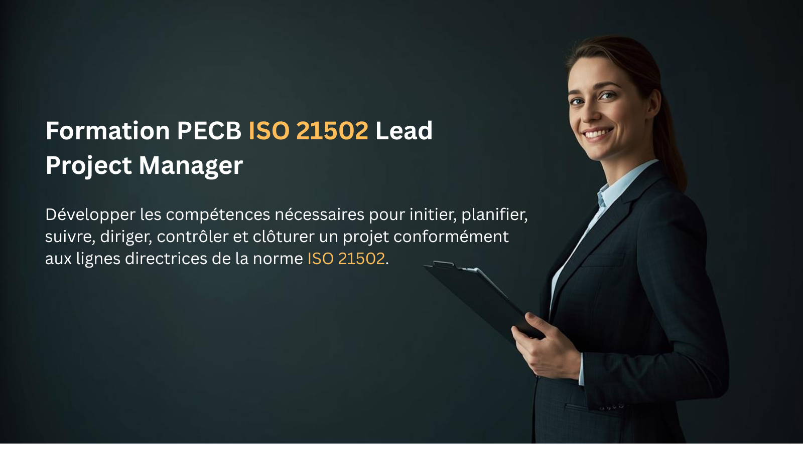 La formation PECB ISO 21502 Lead Project Manager vous aide à développer les compétences nécessaires pour initier, planifier, suivre, diriger, contrôler et clôturer un projet conformément aux lignes directrices de la norme ISO 21502.
