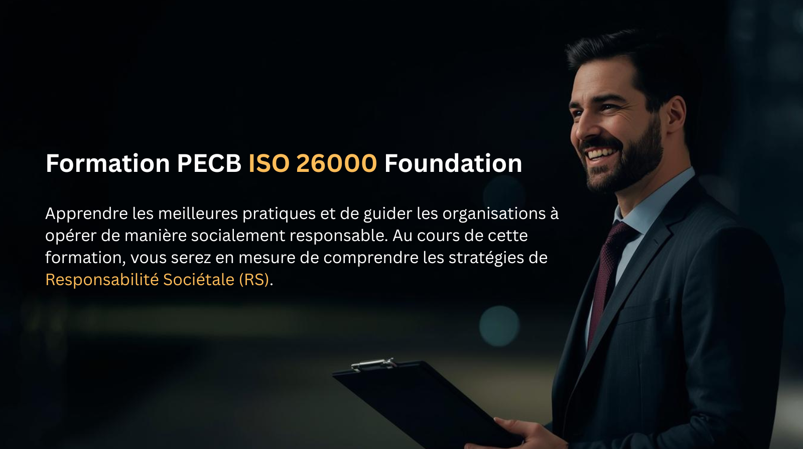 La formation ISO 26000 Foundation vous permet d’apprendre les meilleures pratiques et de guider les organisations à opérer de manière socialement responsable. Au cours de cette formation, vous serez en mesure de comprendre les stratégies de Responsabilité Sociétale (RS).