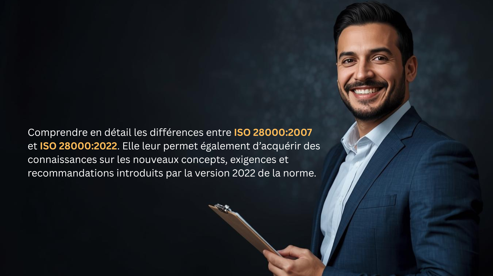 La formation ISO 28000 Transition permet aux participants de comprendre en détail les différences entre ISO 28000:2007 et ISO 28000:2022. Elle leur permet également d’acquérir des connaissances sur les nouveaux concepts, exigences et recommandations introduits par la version 2022 de la norme.