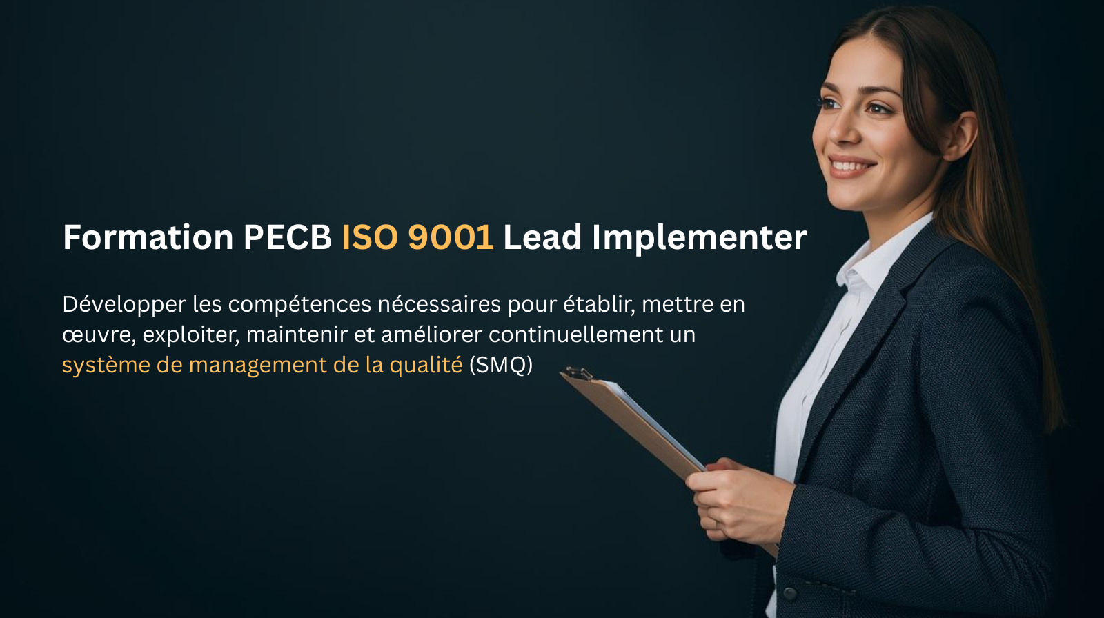 La formation PECB ISO 9001 Lead Implementer est un cours de cinq jours conçu pour vous aider à développer les compétences nécessaires pour établir, mettre en œuvre, exploiter, maintenir et améliorer continuellement un système de management de la qualité (SMQ). Cette formation vise à vous doter d’une connaissance approfondie des exigences de la norme ISO 9001, ainsi que des meilleures pratiques et approches utilisées pour la mise en œuvre et la maintenance d’un SMQ.