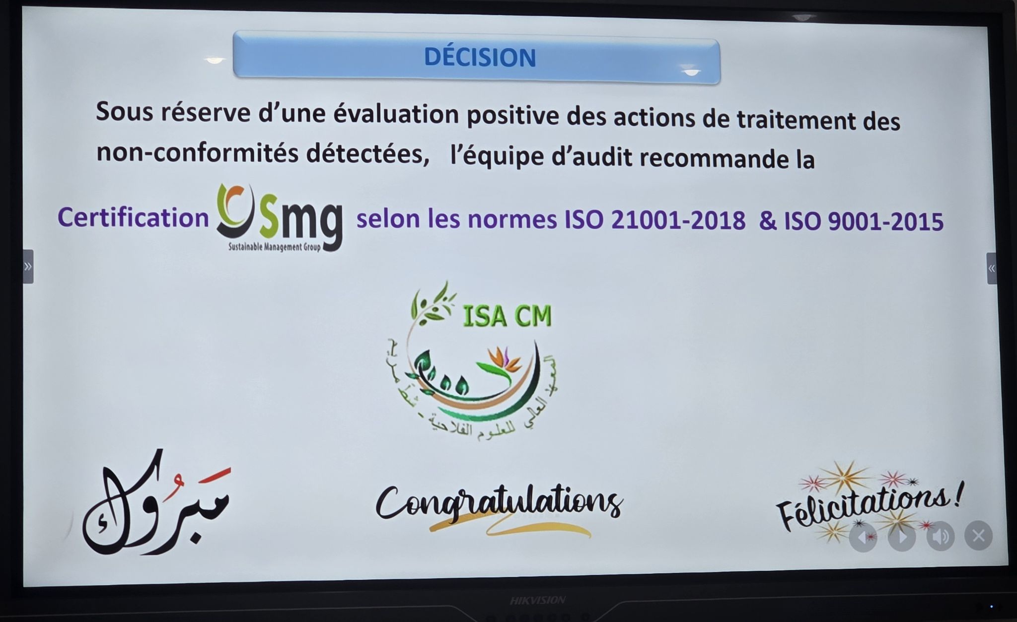📢 Ce 25 septembre 2025 restera une date mémorable pour l’Institut Supérieur Agronomique de Chott Mariem (ISACM), qui vient d’obtenir la recommandation de certification selon les normes ISO 21001 et ISO 9001. 🎉